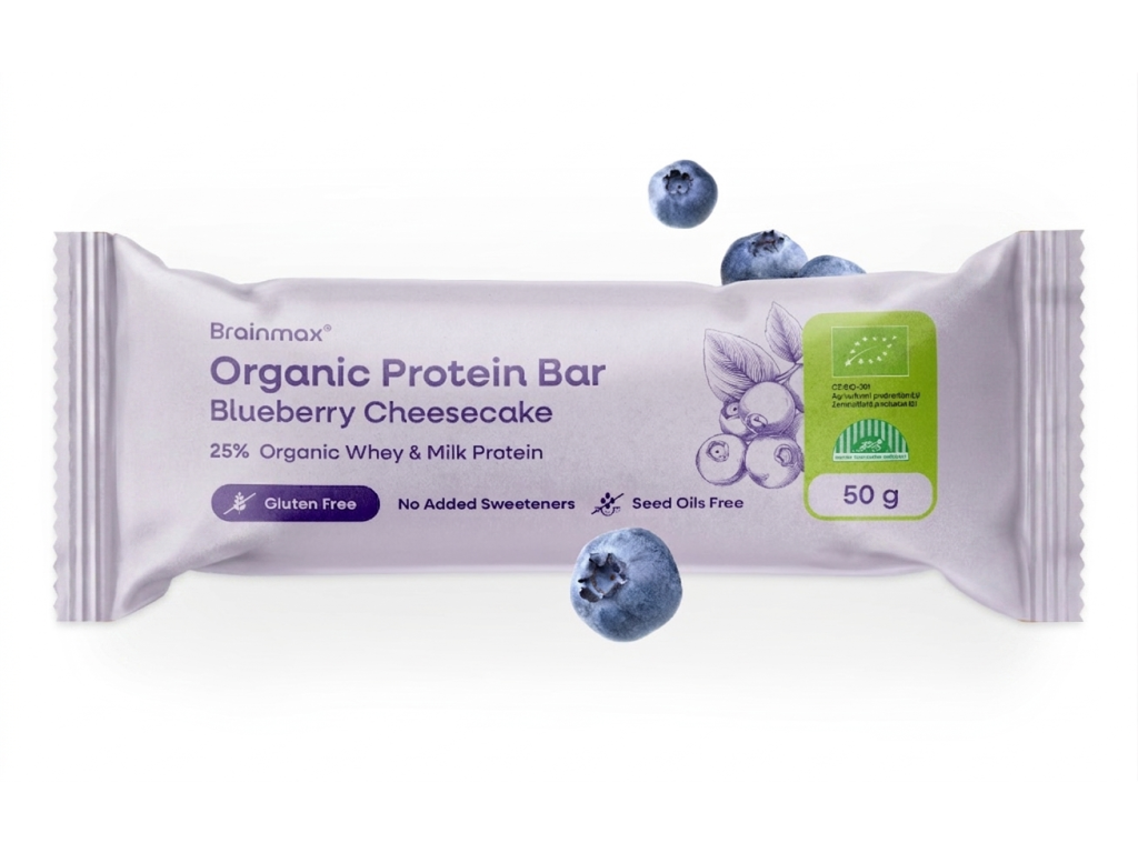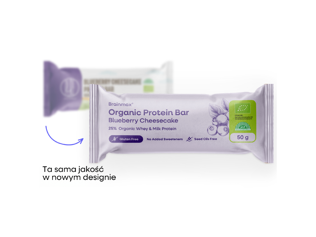 BrainMax Pure® Blueberry Cheesecake Protein Bar, Baton proteinowy, Jagodowy sernik, BIO, 50 g *Certyfikat CZ-BIO-001 / Baton Proteinowy Sernik Jagodowy
