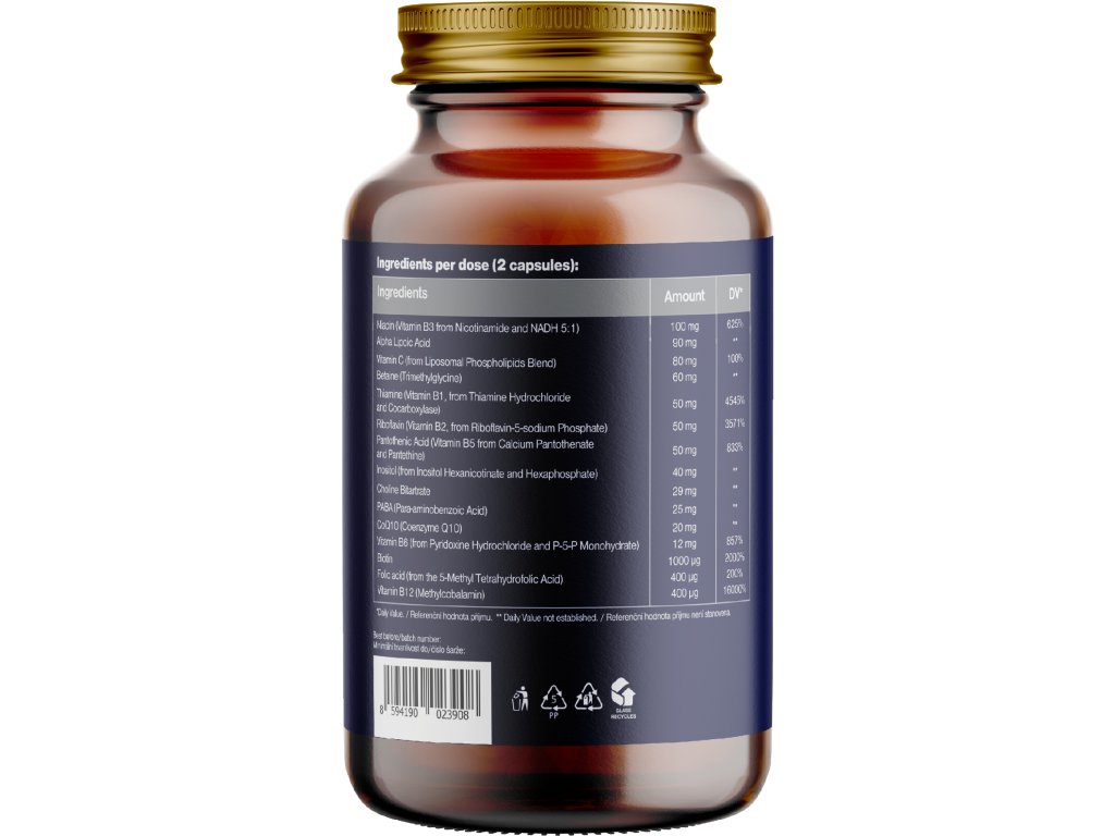 Skład: Witamina B3 (wodorek nikotynamidu i dinukleotydu nikotynoamidoadeninowego), witamina B13 (kwas alfa-liponowy), liposomalna witamina C, betaina bezwodna, witamina B1 (tiamina HCL i kokarboksylaza), witamina B2 (ryboflawina i 5-fosforan ryboflawiny), witamina B5 (pantotenian wapnia i pantetyna), witamina B6 (pirydoksyna i pirydoksalo-5-fosforan), inozytol (heksanikotynian inozytolu i heksafosforan inozytolu), witamina B10 (kwas paraaminobenzoesowy), dwuwinian choliny, koenzym Q10, witamina B7 (biotyna), witamina B9 ( 5-metylotetrahydrofolian), witamina B12 (metylokobalamina), celuloza, kapsułka roślinna na bazie HPMC. Nie zawiera żadnych substancji balastowych (E).