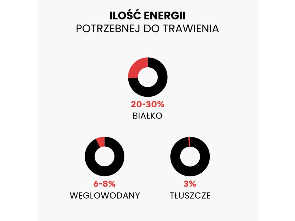 Białka mają wysoką wartość termiczną. Oznacza to, że organizm musi zużyć więcej energii, aby je strawić. A wyższy wydatek energetyczny = szybsza utrata wagi. Na przykład, jeśli zjesz stek o wartości 250 kalorii, możesz oczekiwać, że Twój organizm spali około 50 do 75 kalorii podczas samego trawienia. Jest to jednak tylko przybliżona liczba, a rzeczywista liczba spalonych kalorii może się różnić w zależności od wielu czynników, w tym indywidualnego metabolizmu. Badania wykazały, że wyższe spożycie białka nasila efekt termogeniczny (strawienie wymaga więcej energii), a także zwiększa uczucie sytości. Prowadzi to do zmniejszenia masy ciała i tkanki tłuszczowej. Ponadto białko jest bardziej sycące niż tłuszcz lub węglowodany, co prowadzi do niższego całkowitego spożycia kalorii.