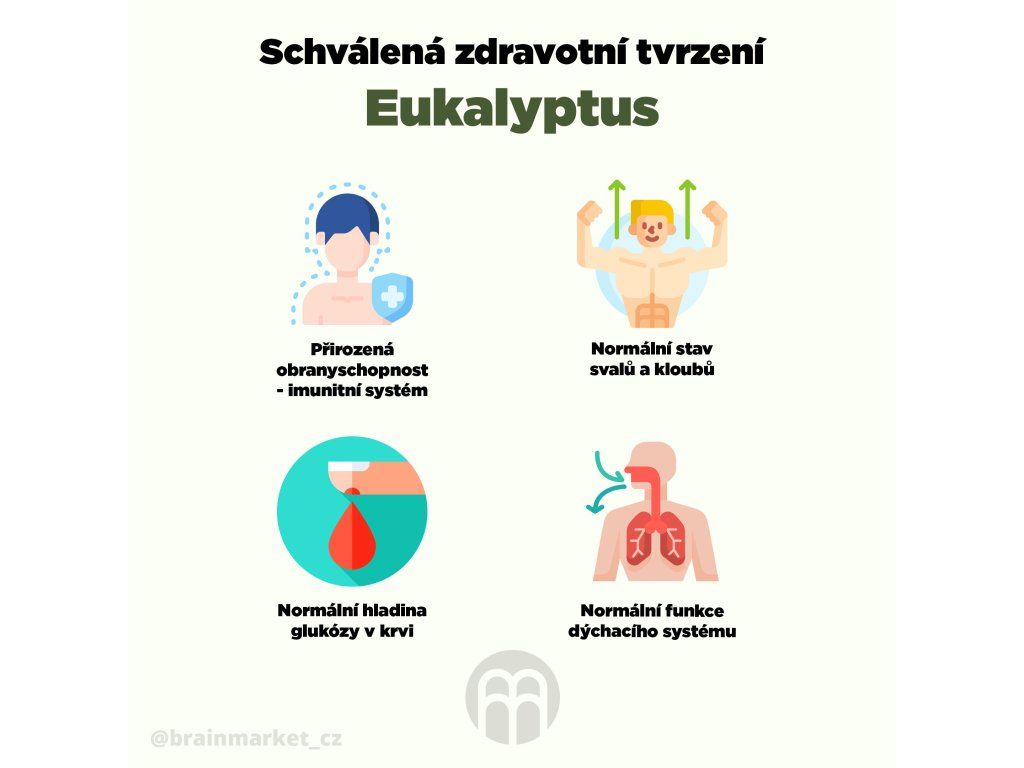 Potencjał przeciwbakteryjny i przeciwdrobnoustrojowy eukaliptusa jest wykorzystywany w wielu płynach do płukania ust. Eucalyptus jest najbardziej znany ze swoich aktywnych składników, które wspomagają cały układ oddechowy. Nalewka z liści eukaliptusa korzystnie wpływa na ogólny stan zdrowia, naturalnie wspierając odporność, jest odpowiednia na przeziębienia, kaszel i astmę. Zmniejsza również przekrwienie i rozluźnia drogi oddechowe w przypadku przeziębienia. Służy między innymi do łagodzenia bólu stawów, wspomagania zmęczonych mięśni oraz regulowania poziomu cukru we krwi.
