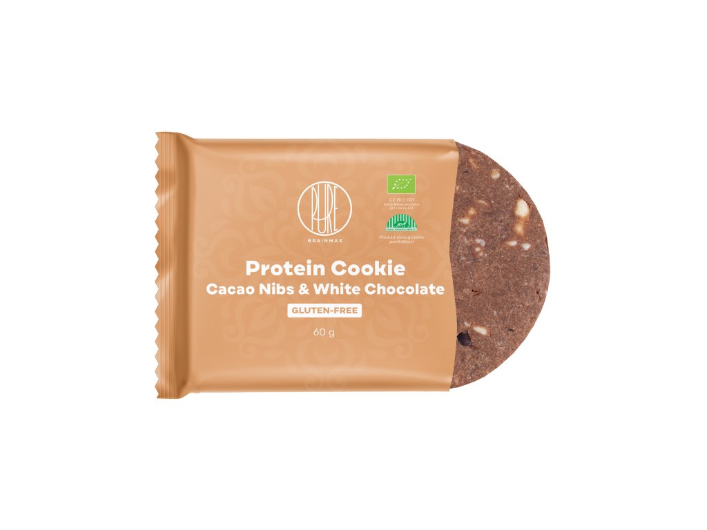 BrainMax Pure Protein Cookie, Ziarna Kakao & Biała Czekolada, BIO, 60 g Ciastko proteinowe z ziarnami kakaowca i białą czekoladą / certyfikat *CZ-BIO-001
