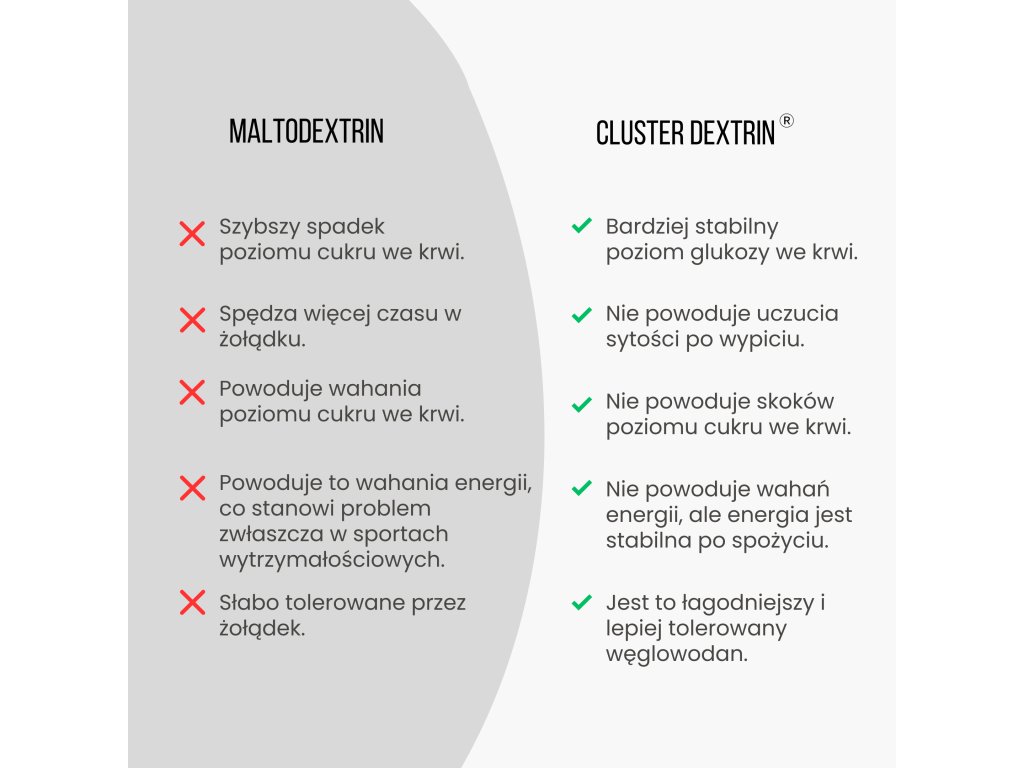 Cluster Dextrin® to złożony węglowodan, który jest łatwo rozpuszczalny w wodzie, co ma wiele zalet potwierdzonych badaniami dla sportowców i osób aktywnych – wydłuża wytrzymałość i zwiększa siłę. Dzięki unikalnej technologii produkcji, Cluster Dextrin® nie zalega długo w żołądku i trafia do jelita cienkiego, skąd przedostaje się do krwiobiegu. Dzięki temu energia jest stabilna przez dłuższy czas. Ponadto, w przeciwieństwie do maltodekstryny, nie powoduje wahań poziomu cukru we krwi. Jest wytwarzany ze skrobi kukurydzianej w reakcjach enzymatycznych, więc nie jest związkiem chemicznym ani mieszaniną wielu węglowodanów, a jedynie Cluster Dextrin.®.
