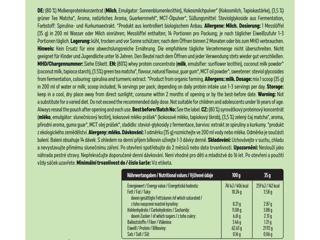 Składniki: (80%) koncentrat białka serwatkowego ( mleko, emulgator: lecytyna słonecznikowa), mleko kokosowe w proszku* (mleko kokosowe, skrobia z tapioki), (3,5%) zielona herbata matcha*, aromat, naturalny aromat, guma guar*, olej MCT w proszku*, substancja słodząca: glikozydy stewiolowe z fermentacji, barwnik spożywczy (ekstrakt ze spiruliny i kurkumy).