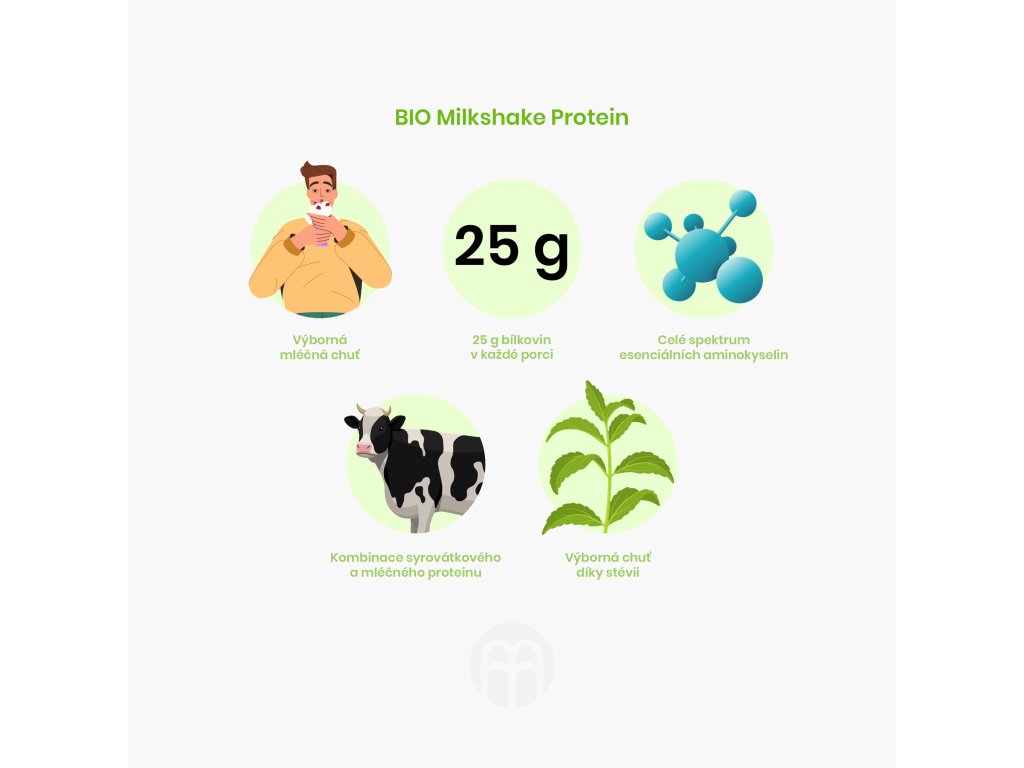 Kombinace BIO syrovátkového a BIO mléčného proteinu zajistí celé spektrum aminokyselin v ideálním poměru, což zajišťuje výbornou využitelnost bílkovin svalovými buňkami. Milkshake obsahuje BIO mléčný a syrovátkový proteinový koncentrát. Syrovátka je jedním z nejlepších zdrojů živočišných bílkovin, protože má vysoký obsah aminokyselin (5,5 g BCAA na dávku), je rychle stravitelná a pomáhá svalům rychleji regenerovat. Díky vyššímu množství tuku a čistého složení bez umělých aromat má vynikající chuť a lehkou napěněnou konzistenci.