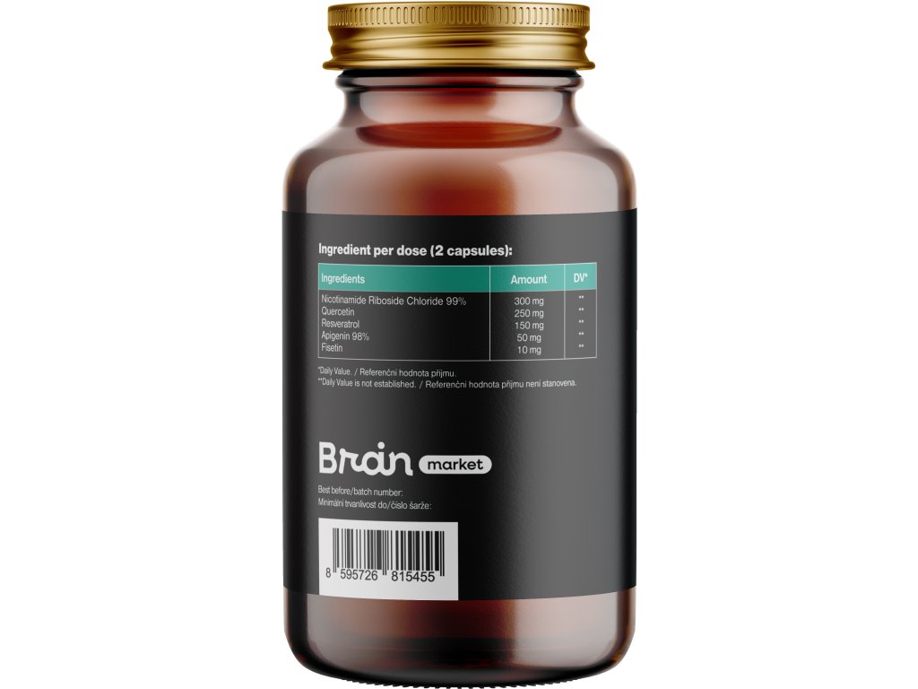Składniki (2 kapsułki): chlorek rybozydu nikotynamidu (300 mg, RWS**), kwercetyna (250 mg, RWS**), resweratrol (150 mg, RWS**), apigenina (50 mg, RWS**), fisetyna (10 mg, RWS**). Kapsułka roślinna na bazie HPMC. Nie zawiera substancji balastowych.