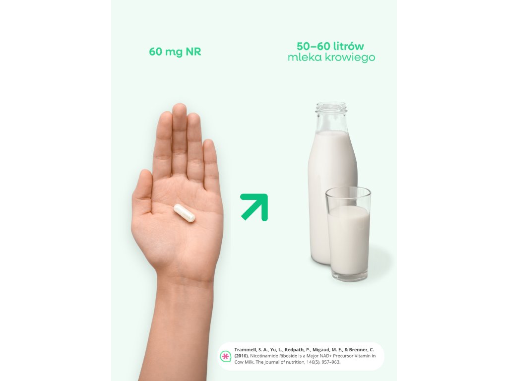 NR odgrywa kluczową rolę w metabolizmie energetycznym1 . NR, w połączeniu z polifenolami, takimi jak resweratrol i kwercetyna, stanowi kompleksową podstawę nowoczesnych protokołów suplementacyjnych. Dawka 300 mg odpowiada około 100 mg niacyny. Jednak w przeciwieństwie do niacyny, nie powoduje zaczerwienienia skóry i dlatego nadaje się do długotrwałego stosowania.