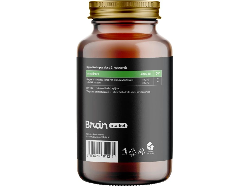 Skład w dawce (1 kapsułka): Ekstrakt z oleju oregano w proszku 4:1 (80% karwakrolu w oleju) (400 mg, RWS **), z czego karwakrol (320 mg, RWS **), maltodekstryna z kukurydzy. Roślinna kapsułka na bazie HPMC. Nie zawiera żadnych substancji balastowych (E-dodatków).