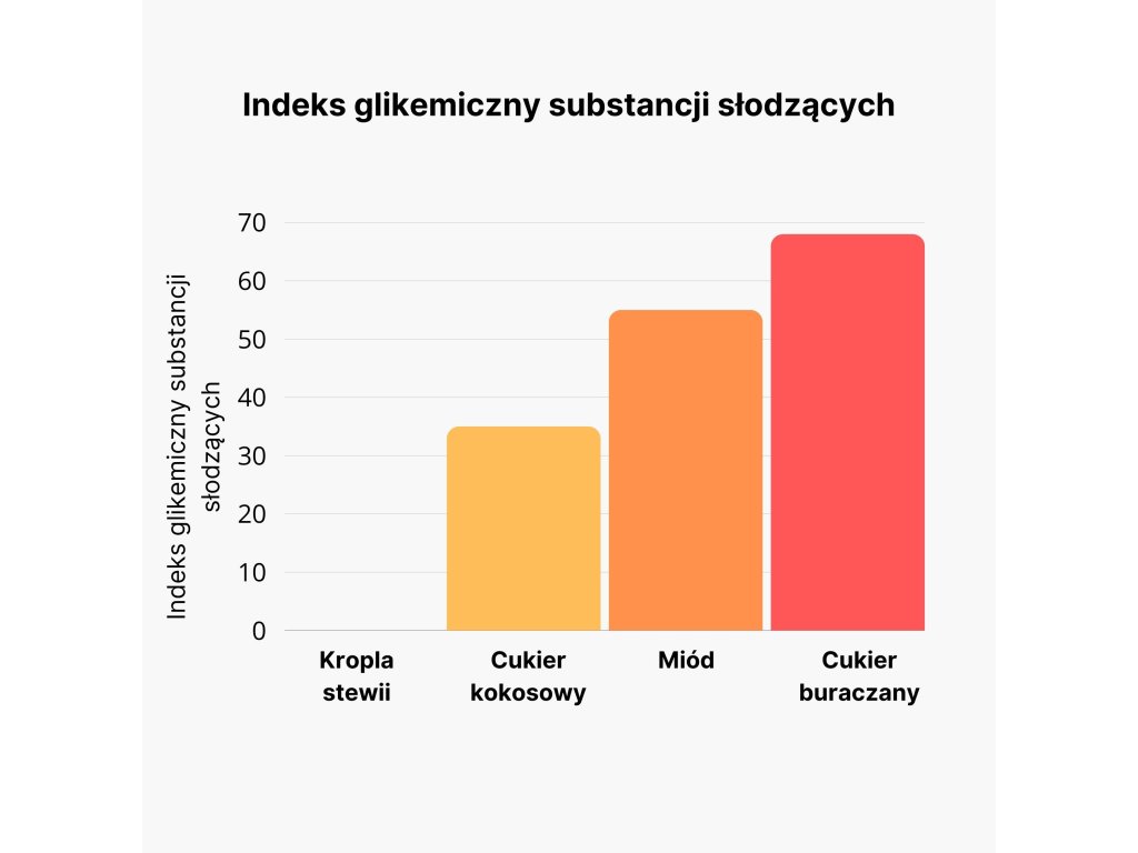 Stewia to roślina, która jest aż 300 razy słodsza od cukru, nie zawiera kalorii i nie podnosi poziomu cukru we krwi, dzięki czemu jest idealnym wyborem dla diabetyków i osób z insulinoopornością. Dodatkowo w porównaniu do sztucznych słodzików nie wpływa negatywnie na mikrobiom jelitowy.