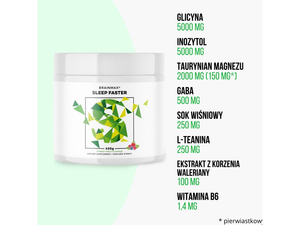 Sleep Faster zawiera osiem synergistycznie działających składników. Zawiera glicynę i aminokwas GABA, które skutecznie wspomagają wyciszenie umysłu. Zawiera również inozytol, który pozytywnie wpływa na nastrój i wraz z koncentratem soku wiśniowego optymalizuje cykl snu. Taurynian magnezu przyczynia się do zmniejszenia uczucia zmęczenia i znużenia, a połączone działanie L-teaniny i ekstraktu z kozłka lekarskiego działa relaksująco na ciało i umysł, sprzyja głębokiemu snu i ułatwia zasypianie. Sleep Faster jest również wzbogacony witaminą B6, która jest niezbędna do produkcji serotoniny i przyczynia się do osiągnięcia wysokiej jakości, głębokiego snu.
