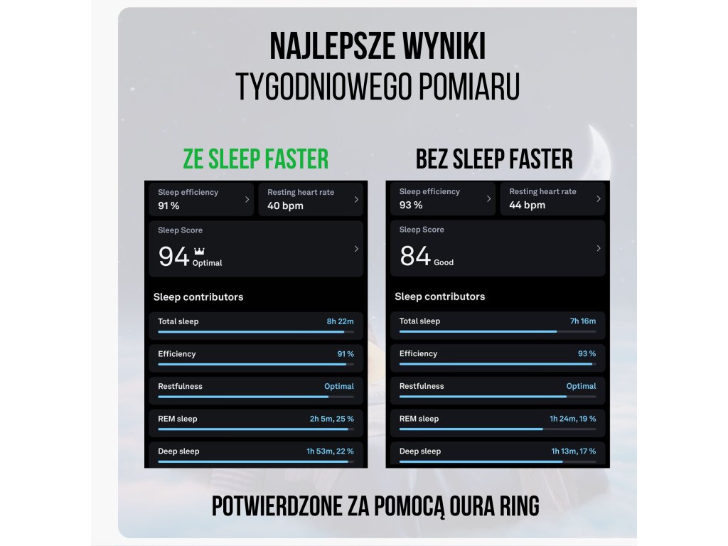 Podczas snu porównywano długość snu całkowitego, fazy REM oraz snu głębokiego. W przypadku programu Sleep Faster faza REM i sen głęboki były dłuższe, co przełożyło się na lepszy wynik. Należy pamiętać, że poszczególne fazy i długość snu mogą się różnić w zależności od wielu czynników. Sen jest bardzo złożony i zależy od wielu aspektów, takich jak ogólny rytm dobowy organizmu, dieta, aktywność fizyczna czy wiek . Zawsze należy brać pod uwagę pozycję wyjściową, czas trwania problemów ze snem i starać się dostosować swoją rutynę snu.