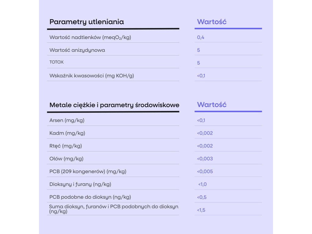 Stabilność oksydacyjna i czystość są istotnymi wskaźnikami nie tylko jakości olejów omega 3, ale także tego, czy mają one pozytywny, czy negatywny wpływ na organizm. Dlatego te wartości są dla nas ważne. TOTOX i inne wskaźniki odzwierciedlają stopień utlenienia, a zatem świeżość i stabilność produktu. Jednocześnie monitorujemy również zawartość metali ciężkich, takich jak arsen czy rtęć, oraz innych zanieczyszczeń środowiskowych, w tym dioksyn i PCB (polichlorowanych bifenyli). Wyniki analiz gwarantują pozytywny efekt oleju i jego przydatność do długotrwałej suplementacji.