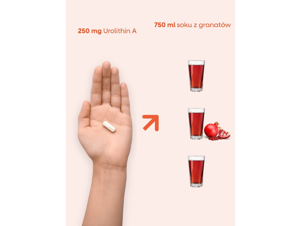 Składniki: Urolityna A (500 mg, RWS**), resweratrol (150 mg, RWS**), trimetyloglicyna (TMG) (100 mg, RWS**), koenzym Q10 (60 mg, RWS**), pirolochinolinochinon (PQQ) (10 mg, RWS**). Kapsułka na bazie HPMC pochodzenia roślinnego. Nie zawiera substancji balastowych (E).