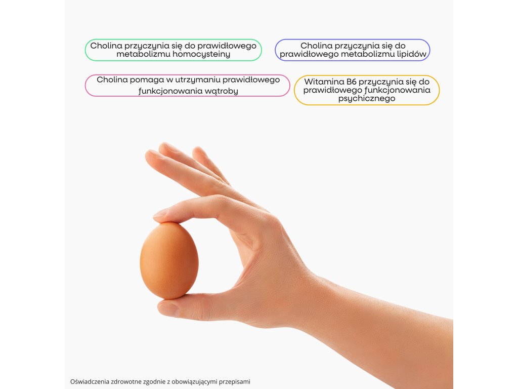 Cholina jest substancją bardzo podobną do witamin z grupy B i występuje w powszechnych produktach spożywczych, zwłaszcza tych bogatych w tłuszcze i białka. Najbogatsze źródła to jaja i wątroba, ale cholinę można znaleźć również w łososiu, brokułach, soi i produktach mlecznych. Ale dlaczego jej spożycie jest czasami niewystarczające? Zwłaszcza ze względu na zwiększone zapotrzebowanie, np. w czasie ciąży, napięcia wewnętrznego lub wysiłku fizycznego, a organizm nie jest w stanie wchłonąć jej w wystarczających ilościach. U wegan i wegetarian spożycie choliny jest jeszcze niższe.