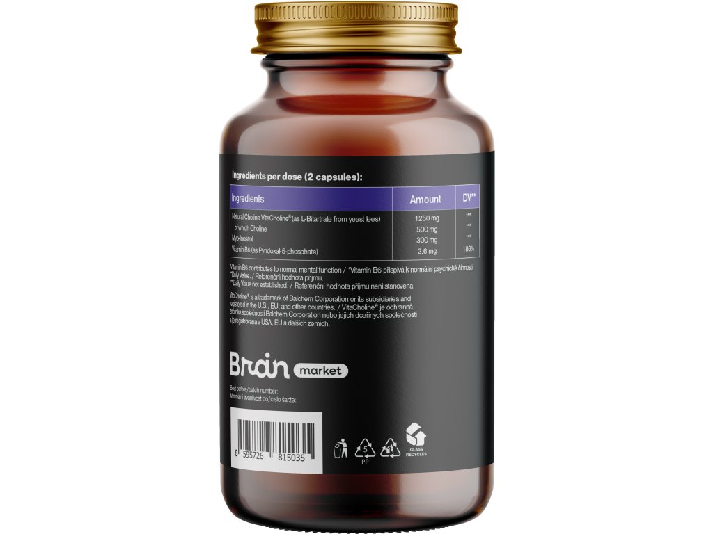 Jedna kapsułka BrainMax VitaCholine® & Inositol zawiera 625 mg dwuwinianu choliny, co odpowiada 250 mg elementarnej choliny - co stanowi część dziennego spożycia.