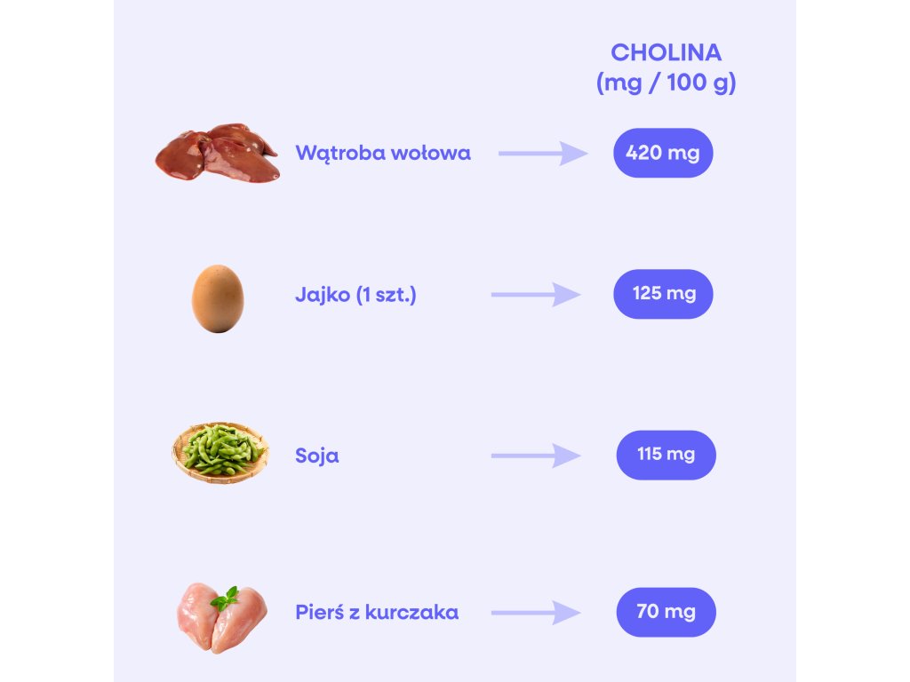 Aby dorosły mężczyzna mógł otrzymać zalecaną dawkę 550 mg choliny dziennie, musiałby zjeść dziennie np. 4 jajka lub ponad 100 g wątroby wołowej – dlatego suplementacja choliną sprawdza się również w formie suplementu diety.