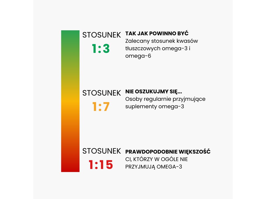 Problemem dzisiejszych czasów i diety zachodniej jest wysokie spożycie kwasów tłuszczowych omega-6 w porównaniu do omega-3. Przeciętny Europejczyk ma stosunek komórkowy omega-3 do omega-6 wynoszący 1:15 . Oznacza to, że na każdą część omega-3 przypada 15 części omega-6. Jednak zdrowy stosunek zaczyna się od stosunku 1:5, a najbardziej optymalny jest 1:3. Przy stosunku 1:3 błony komórkowe funkcjonują prawidłowo, co przekłada się na ogólny lepszy stan zdrowia na wszystkich poziomach. Z kolei przy stosunku 1:15 i wyższym w organizmie rozwija się niezdrowe środowisko, a jednostka jest znacznie bardziej podatna na choroby cywilizacyjne. Wszystko to jest spowodowane złą dietą opartą na wysokim spożyciu omega-6 z pożywienia (smażone produkty, oleje roślinne, produkty zwierzęce z hodowli przemysłowych). Zanim dieta zachodnia dotarła do Eskimosów, stwierdzono, że mieli oni stosunek komórkowy 1:2 i praktycznie nie cierpieli na żadne choroby. Dlatego Twoim celem powinno być ograniczenie spożycia kwasów omega 6 i zwiększenie spożycia wysokiej jakości kwasów omega 3.