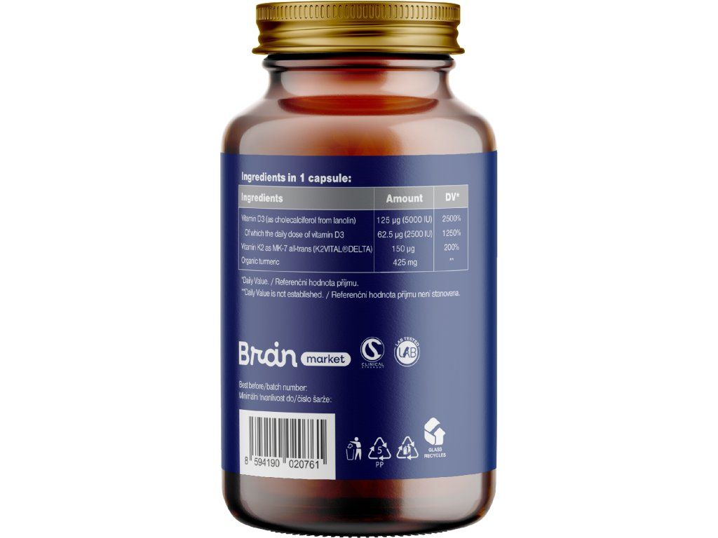 Skład w 1 kapsułce: Bio kurkuma (Curcuma longa) proszek z korzenia 435 mg**, kapsułka: hydroksypropylometyloceluloza (HPMC), witamina K2 K2VITAL®DELTA (menachinon-7 z muszkatu) 150 μg (200%*), witamina D3 (cholekalcyferol z lanoliny) 100 μg / 4000 IU (2000%*).