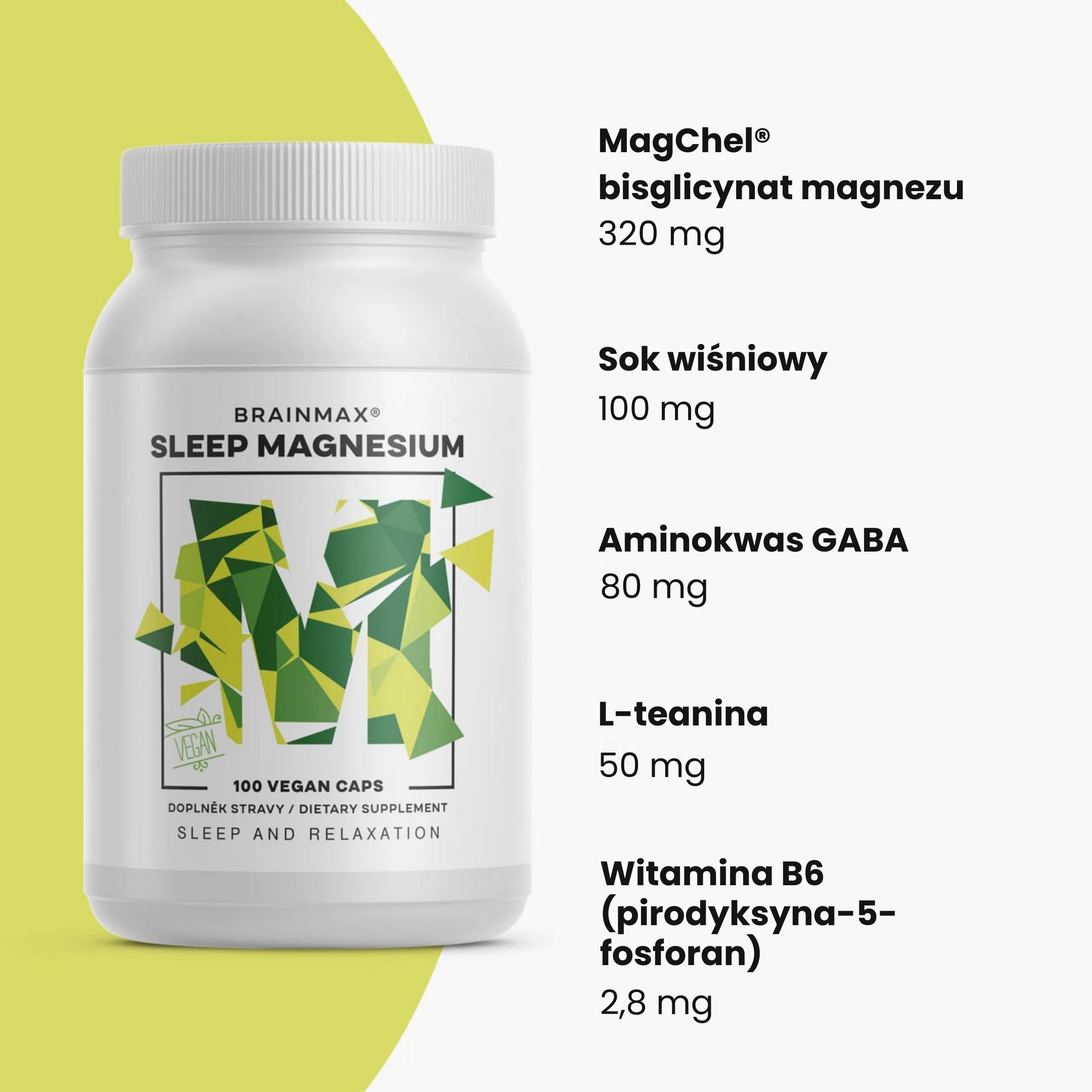 Kiedy organizm jest zestresowany, magnez jako pierwszy znika. Dlatego wybraliśmy Sleep Magnesium, który zawiera bisglicynian magnezu - łagodną, chelatowaną formę o doskonałej wchłanialności. Wspomaga prawidłowe funkcjonowanie układu nerwowego, zmniejszając uczucie zmęczenia i znużenia oraz zapewniając jednocześnie dobry sen. Wzbogacony o aktywną formę witaminy B6 (P-5-P) dla maksymalnego wykorzystania magnezu w organizmie.