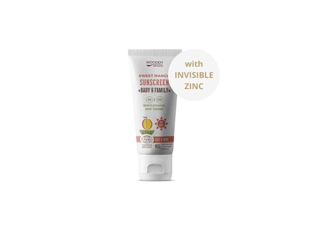 Drewniana łyżka, balsam do ciała z filtrem przeciwsłonecznym Mango Baby & Family, SPF 50, 100 ml Naturalny mineralny balsam do opalania o zapachu mango.