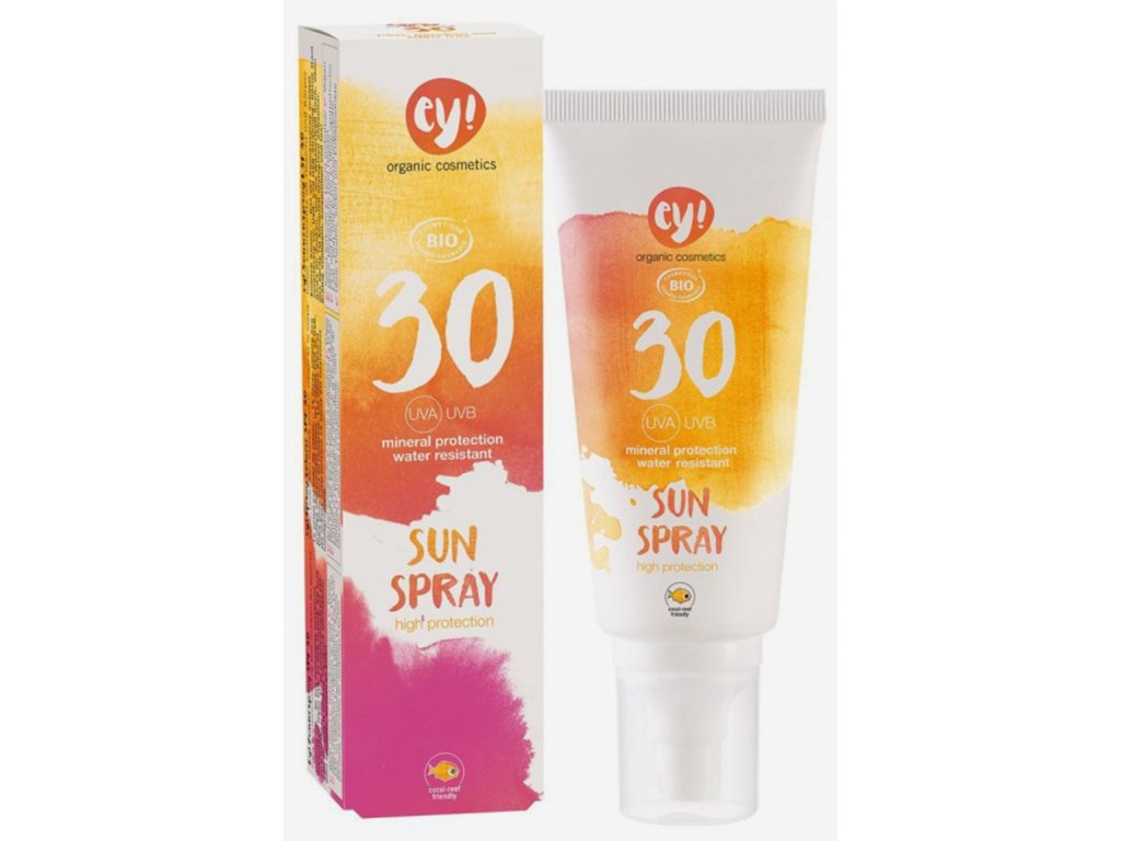 W 100% naturalny spray do opalania z bardzo wysoką ochroną Faktor SPF 30 z nowej serii Ey! niemieckiego producenta Eco Cosmetics zapewnią Twojej skórze tak potrzebną ochronę przed promieniami słonecznymi. Jest w tym wyjątkowy nie zawiera wody , ale wysokiej jakości oleje roślinne (oliwka, jojoba, rzepak). Tak dobrana kombinacja pielęgnuje Twoją skórę i zapobiega jej wysuszeniu. Łatwy w aplikacji i rozprowadzaniu. Nadaje się również do stosowania na twarz i jest wodoodporny .