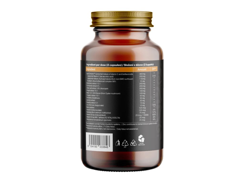 5. KATSOULIERIS, Elias N. The olive leaf extract oleuropein exerts protective effects against oxidant-induced cell death, concurrently displaying pro-oxidant activity in human hepatocarcinoma cells. 2016. 6. OZKUR, Mehtap, Necla BENLIER, Işıl TAKAN, et al. Ginger for Healthy Ageing: A Systematic Review on Current Evidence of Its Antioxidant, Anti-Inflammatory, and Anticancer Properties. 2022. 7. YÜCEL, Çiğdem, Gökçe Şeker KARATOPRAK, Özlem BAHADIR AÇIKARA, Esra Küpeli AKKOL, Timur Hakan BARAK, Eduardo SOBARZO-SÁNCHEZ, Michael ASCHNER a Samira SHIROOIE. Immunomodulatory and anti-inflammatory therapeutic potential of gingerols and their nanoformulations. 2022. 8. MASHHADI, Nafiseh Shokri, Reza GHIASVAND, Gholamreza ASKARI, Mitra HARIRI, Leila DARVISHI a Mohammad Reza MOFID. Anti-Oxidative and Anti-Inflammatory Effects of Ginger in Health and Physical Activity: Review of Current Evidence. 2013. 9. DE MARCO CASTRO, Elena, Philip Calder CALDER a Helen M ROCHE. Β-1,3/1,6-Glucans and Immunity: State of the Art and Future Directions. 2021. 10. CERLETTI, Chiara, Simona ESPOSITO a Licia Iacoviello IACOVIELLO. Edible Mushrooms and Beta-Glucans: Impact on Human Health. 2021. 11. COHEN, Marc. Rosehip - an evidence based herbal medicine for inflammation and arthritis. 2012. 12. MAYWALD, Martina a Lothar Rink RINK. Zinc in Human Health and Infectious Diseases. 2022. 13. MAARES, Maria a Hajo HAASE. Zinc and immunity: An essential interrelation. 2016. 14. GAMMOH, Nour Zahi a Lothar RINK. Zinc in Infection and Inflammation. 2017. 15. WESSELS, Inga, Henrike Josephine FISCHER a Lothar RINK. Dietary and Physiological Effects of Zinc on the Immune System. 2021. 16. KHALILI, PHD, Azadeh, Shohreh ALIPOUR, PHD, Mohammad FATHALIPOUR, PHD,, Azar PURKHOSROW, MSC, Elaheh MASHGHOOLOZEKR, MSC, Gholamreza BAYAT, PHD a Ali Akbar NEKOO. Liposomal and Non-Liposomal Formulations of Vitamin C: Comparison of the Antihypertensive and Vascular Modifying Activity in Renovascular Hypertensive Rats. 2020. 17. DAVIS, Janelle L., Hinter L. PARIS, Joseph W. BEALS, et al. Liposomal-encapsulated Ascorbic Acid: Influence on Vitamin C Bioavailability and Capacity to Protect Against Ischemia–Reperfusion Injury. 2016. 18. GOPI, Sreerag a Preetha BALAKRISHNAN. Evaluation and clinical comparison studies on liposomal and non-liposomal ascorbic acid (vitamin C) and their enhanced bioavailability. 2021. 19. https://www.frontiersin.org/articles/10.3389/fphar.2021.719758/full Składniki: LIPOCOMPLEX VITAMIN C® Liposomalna mieszanka witaminy C i bioflawonoidów (liposomalna witamina C (w postaci kwasu askorbinowego), fosfolipidy ze słonecznika niemodyfikowanego genetycznie, bioflawonoidy cytrusowe Aurantium 98%), ekstrakt z czarnego bzu 10:1, ekstrakt z jeżówki 4%, ekstrakt z liści oliwnych 18% oleuropeina, ekstrakt z imbiru 10:1, Beta-1,3/1,6-D-glukan (z boczniaka), S-acetylo-L-glutation, ekstrakt z lukrecji, ekstrakt z oregano 10:1, ekstrakt z dzikiej róży 5:1, cynk (z bisglicynianu cynku), beta-karoten, witamina A (octan retinylu), selen (z metioniny selenu), witamina D3 (w postaci cholekalcyferolu), witamina K2 (w postaci MK-7 all-trans K2 VITAL®DELTA), molibden (z molibdenianu sodu). Dystrybutor: BRAINMARKET s.r.o., Hladnovská 83, Ostrawa. Przechowywanie: W temperaturze pokojowej, w suchym i ciemnym miejscu. Ostrzeżenie: Suplement diety. Nie zastępuje zróżnicowanej diety. Przechowywać w miejscu niedostępnym dla dzieci. Nie przekraczać zalecanej dziennej porcji. Produkt nie jest przeznaczony dla dzieci. Wielkość opakowania: 60 kapsułek roślinnych