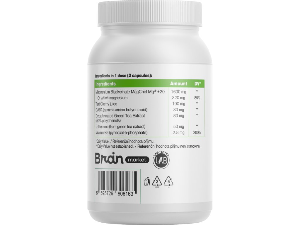 Składniki: Bisglicynian magnezu MagChel® Mg +20 1600 mg w tym magnez 320 mg, Prunus Cerasus (sok z wiśni kwaśnej) 100 mg, GABA Kwas gamma-aminomasłowy 80 mg, Bezkofeinowy ekstrakt z zielonej herbaty (50% polifenoli) 80 mg, L-teanina (z ekstraktu z zielonej herbaty) 50 mg, Witamina B6 Pirydoksal-5-fosforan 2,8 mg. Kapsułka roślinna na bazie HPMC. Nie zawiera substancji balastowych (E).