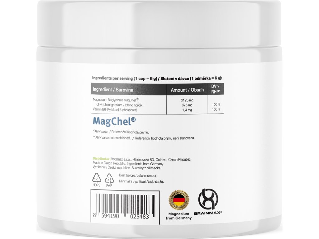 Jedna miarka pokrywa 100% dziennego zapotrzebowania na magnez. Wysoce użyteczna organiczna forma chelatu magnezu, zawierająca aminokwas glicynę i magnez. Dodatkowo, uzupełnia ona 100% dziennej dawki witaminy B6 w jej aktywnej postaci – fosforanu pirydoksalu-5, który wzmacnia pozytywny wpływ na układ nerwowy i organizm.
