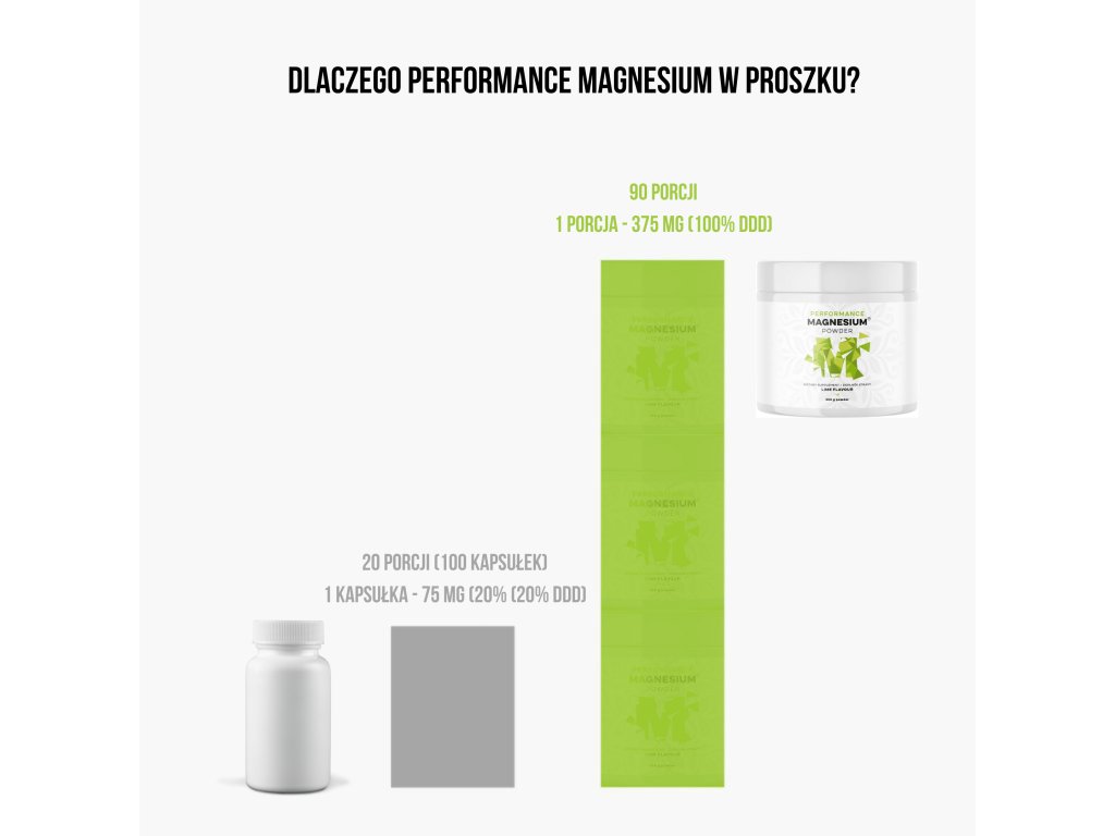 Zalecana dzienna dawka magnezu wynosi 375 mg. Oznacza to, że należy przyjmować 5 kapsułek dziennie, co daje powszechnie dostępną zawartość 75 mg magnezu pierwiastkowego. Gdyby takie opakowanie zawierało 100 kapsułek, otrzymalibyśmy 20 dawek. Proszek magnezowy Performance Magnesium zawiera 375 mg magnezu pierwiastkowego w każdej dawce. Zatem 1 miarka wystarcza na pokrycie zalecanej dziennej dawki magnezu. Opakowanie zawiera 90 dawek, a cena jednej dawki wynosi 6,1 CZK.