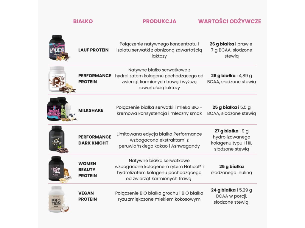 Zarówno LAUF, jak i Performance Protein® zawierają natywne białko najwyższej jakości. Z tą jednak różnicą, że LAUF zawiera 100% natywnego białka w postaci izolatu i koncentratu w proporcji 1:1. Podczas gdy Performance Protein® zawiera 62% natywnego białka serwatkowego i 26% kolagenu pochodzącego od zwierząt karmionych trawą. Jednocześnie wzbogacony jest o krowią siarę i mleko kokosowe. Białko LAUF zawiera bogatsze spektrum aminokwasów, zwłaszcza proanaboliczną leucynę, gdyż zawiera 100% natywnego białka serwatkowego. Białko LAUF jest bardziej ukierunkowane na suplementację białkiem nie tylko w celu zwiększenia wydajności sportowej i wzrostu mięśni, podczas gdy Performance Protein® ma szersze zastosowanie dla odporności, jelit, ale także treningu.