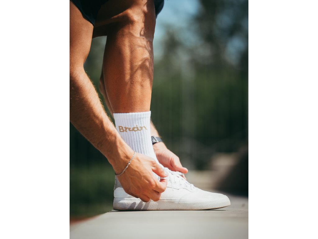 Skarpety sportowe BrainMax wykonane są w 70% z bawełny organicznej BIO, w 28% z regenerowanego nylonu i w 2% z elastanu, co zapewnia optymalną oddychalność, trwałość i elastyczność. Dzięki anatomicznemu krojowi i delikatnemu ściągaczowi idealnie trzymają się stopy nawet podczas całodziennego noszenia lub treningu. Regenerowany nylon przyczynia się do dłuższej żywotności i bardziej zrównoważonego podejścia do produkcji.